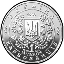 Sul dritto della moneta al centro di un cerchio formato da punti c'è l'immagine di un piccolo Emblema di Stato dell'Ucraina incorniciato in rami di viburno. Sopra l'emblema c'è la data di millenovecentonovantasei - l'anno del conio della moneta. Nel cerchio dell'iscrizione: nella parte superiore di UCRAINA, in fondo a tre righe 1 MILIONE DI RUBBIE. A sinistra ea destra della cifra 1 c'è una designazione e un campione del metallo prezioso Ag 925 e il suo peso in purezza è 15,55.